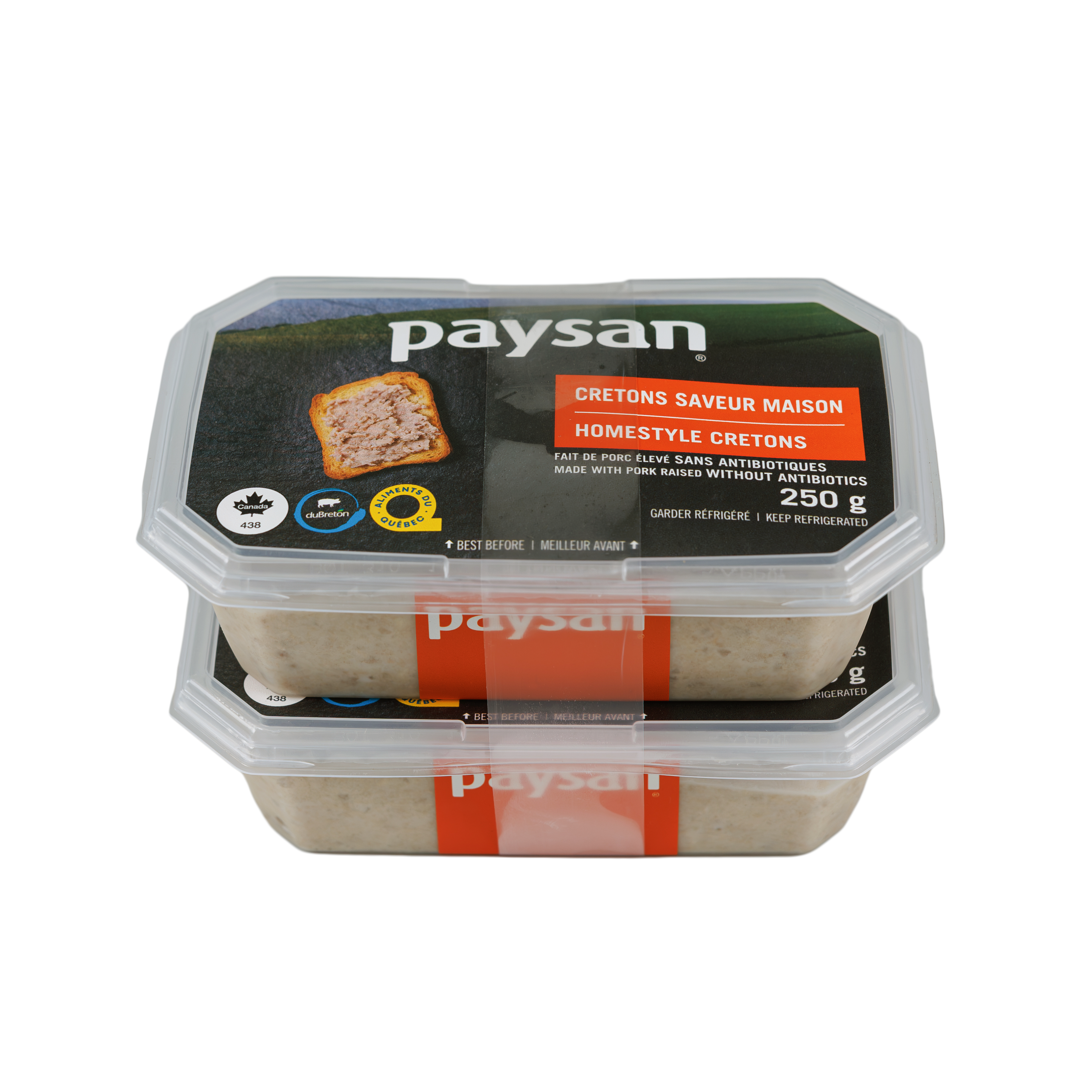 Ces cretons sont faits de porc élevé sans antibiotiques, d'ingrédients naturels, sans ajout d'agents de conservation et sans GMS. Ils sont vendus en format économique de 2 paquets de 250 g.